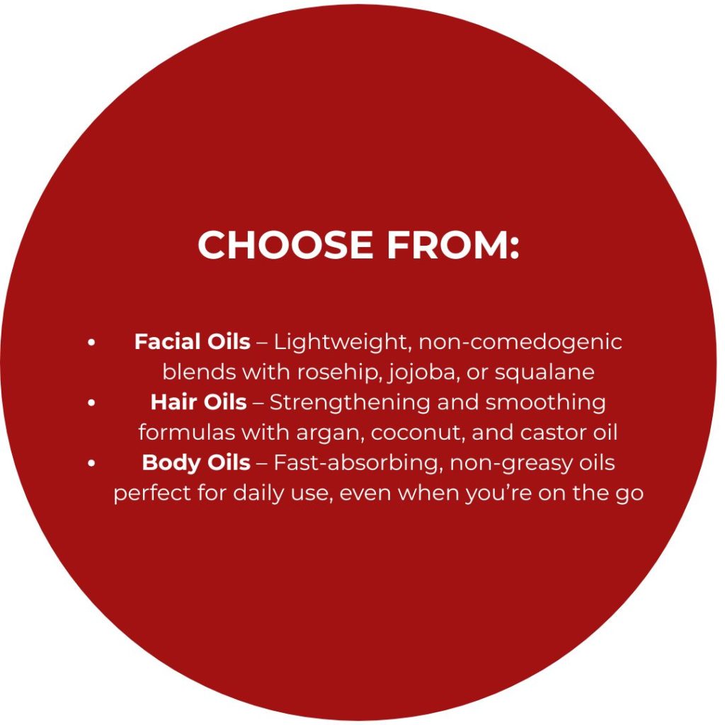 This is where we shine, we offer a curated collection of private label oils using only the finest cold-pressed, natural, and nutrient-rich oils sourced from trusted suppliers around the globe. Designed for more than just massage, our oils serve multiple purposes – providing hydration, nourishment, and wellness benefits for all skin and hair types.